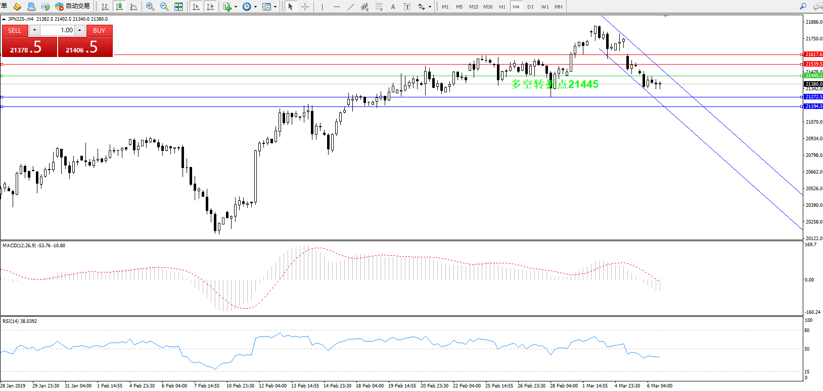 日本股市在星期三走低,其中化工、石油和塑料、造船业和橡胶等下跌的板块带领股指走低。日经指数 .N225 收跌0.6%至21,596.81点,支撑位见于25日移动均线切入位21,177点附近。市场依然存在对中美贸易问题的担忧,此前美国务卿蓬佩奥在接受媒体采访时说,如果美中贸易协议不完美,总统特朗普将会予以拒绝,但美国仍将继续努力进行磋商。美国2月ADP就业人数增幅不及预期,美国2月ADP就业人数增加18.3万,预期增加19万,前值增加21.3万,只要就业人数超过10万,在当前周期下就是十分健康的水平。