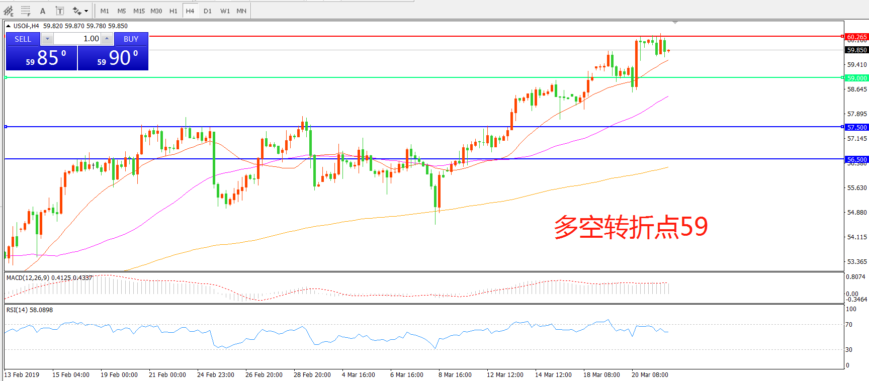 4小时图看,油价触碰60美元阻力后小幅回落,但整体上升形态依然完好,均线系统呈多头排列,MACD红柱走平,思路上依然以逢低做多为主。