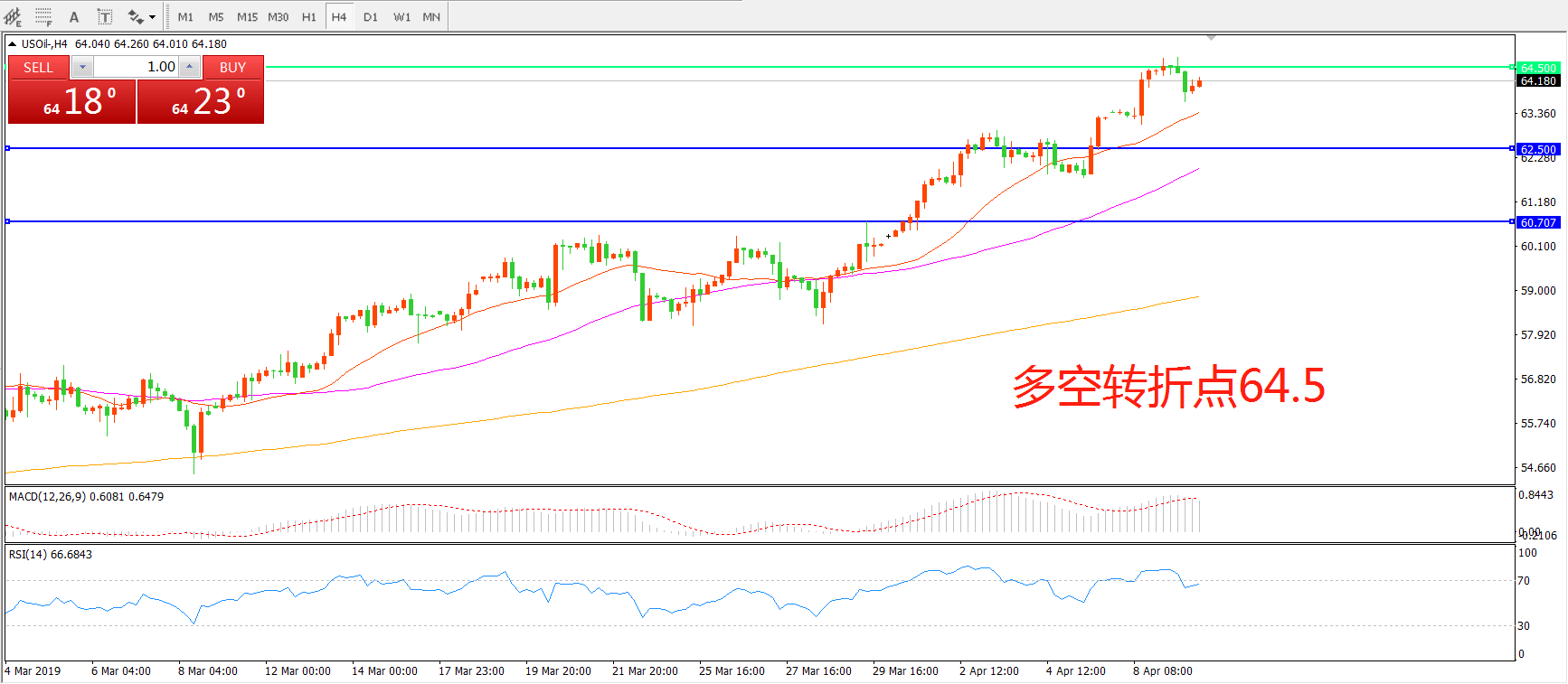俄罗斯总统普京稍早发表讲话称,虽然该国已经做好准备继续与石油输出国组织(OPEC)进行合作,但不会支持油价不受控制的走高,并暗示当前油价令莫斯科感到满意。俄罗斯的暗示令美油周二(4月9日)盘中从数月高位适度回落,最终收报 64.11美元/桶。美国石油学会(API)周二(4月9日)公布报告称,API原油库存增加409万,增幅远超预期,但汽油和精炼油库存则双双大降。晚间EIA数据重点关注,目前市场预计增加229.4万桶。