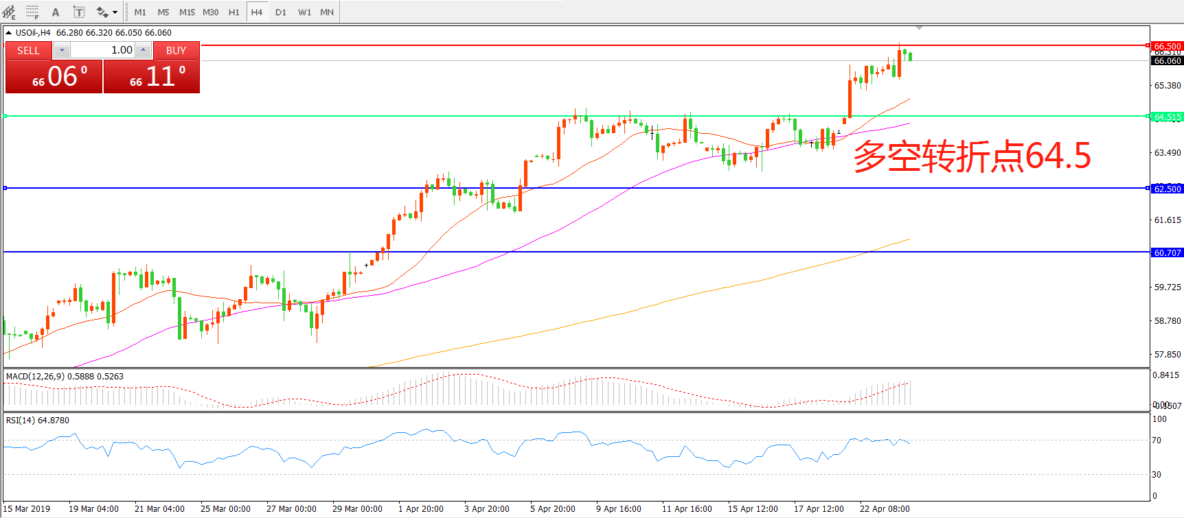 4月23日周二,美国石油学会(API)周二(4月23日)公布报告称,API原油库存意外大增近700万桶,汽油和库欣库存也双双录得增长。数据公布后,美油短线下挫,但受伊朗制裁事件影响,虽然美国希望沙特等国能够填补伊朗原油出口缺口,但沙特似乎并不急于推高产量,这令投资者对油价的看多情绪依然高涨。美油最终收报66.09美元/桶,重点关注晚间EIA数据表现。