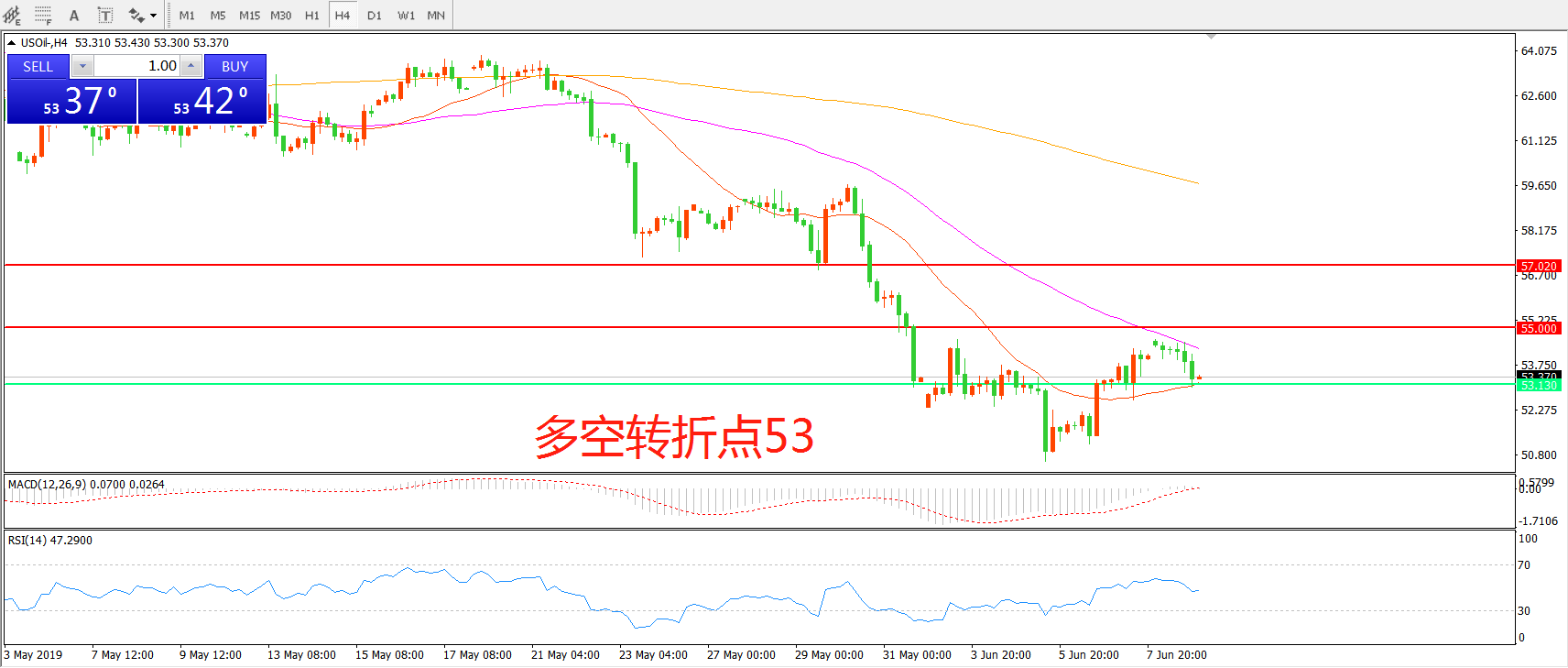 4小时图看,油价低位震荡后长阳反弹,触碰55周期均线后震荡回落,短期走势偏空, MACD绿柱减少,RSI指标走平,日内仍重点关注53附近得失。
