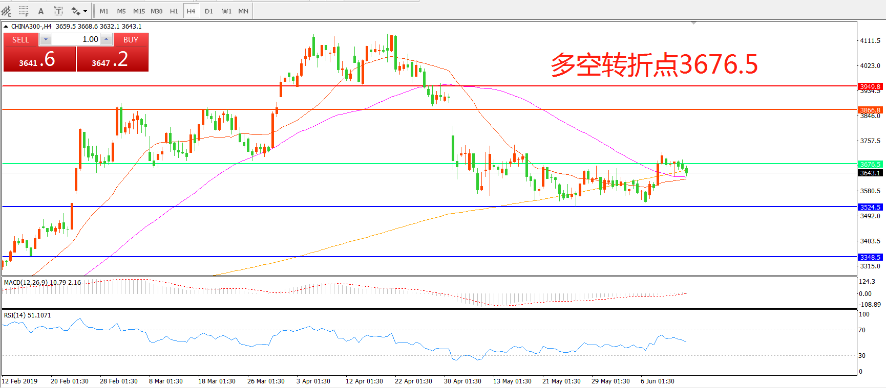 4小时图看,沪深300指数经过连续整理初步站稳3676.5一线,走势有所回暖,但整体方向仍然偏空,均线系统粘合形成下方支撑,MACD绿柱缩短,RSI指标拐头向下,日内延续上行概率较大。
