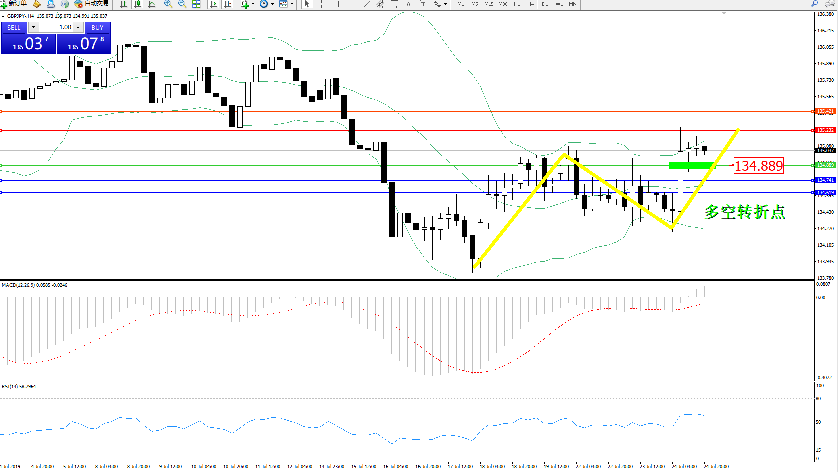交易策略:134.889上方看涨,目标135.232、135.421