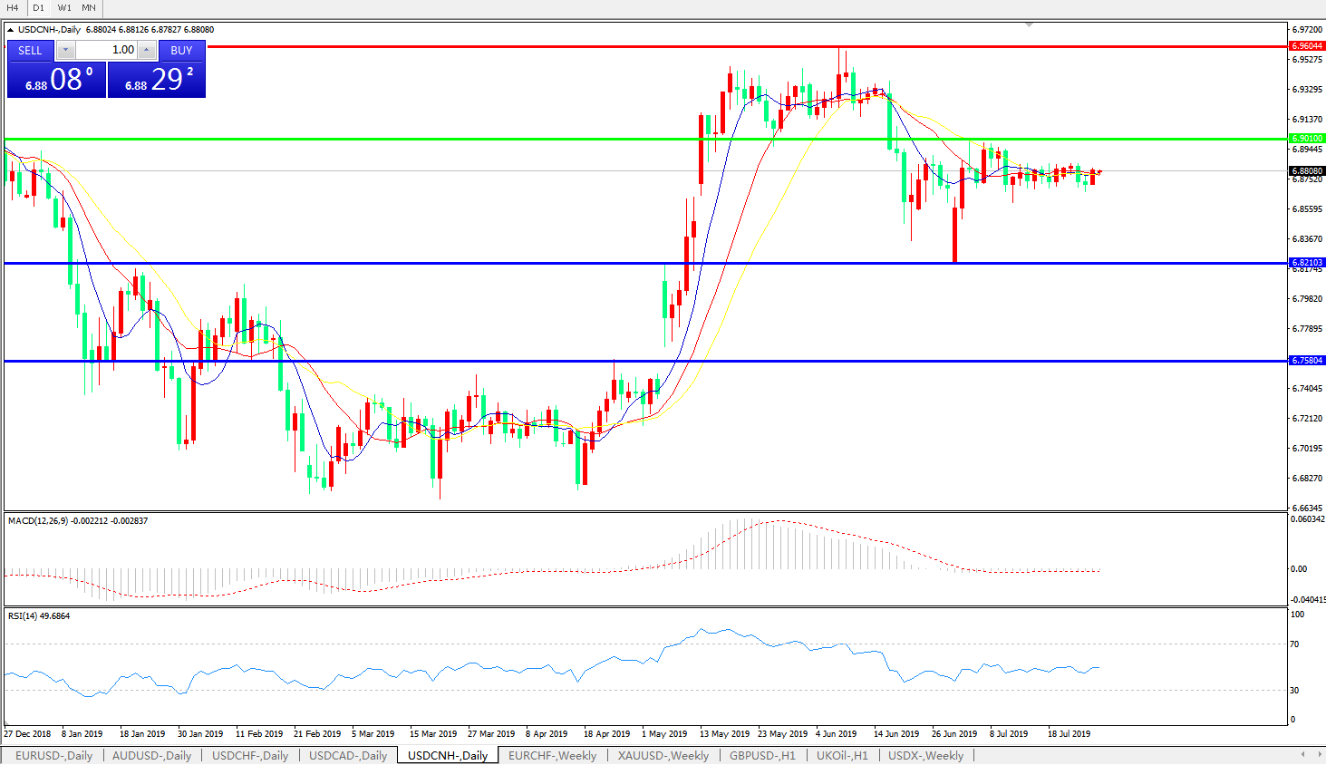 交易策略: 在6.9010之下,看跌,目标价位为6.8210,然后为6.7580。