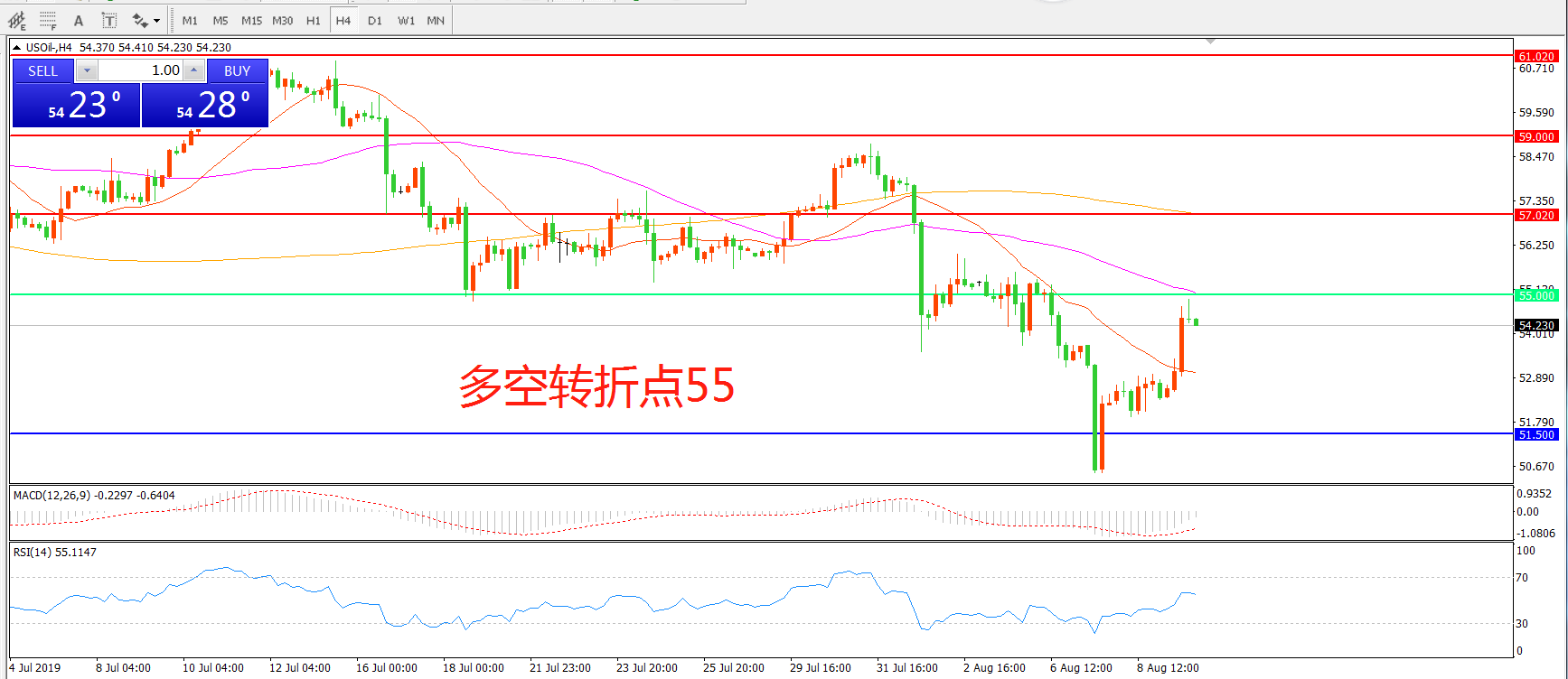 4小时图看,油价大跌后震荡回升,短期反弹力度较强,21周期均线被突破 ,55周期均线成为短期多空分水岭,MACD绿柱减少, RSI指标走平,日内延续震荡概率较大。