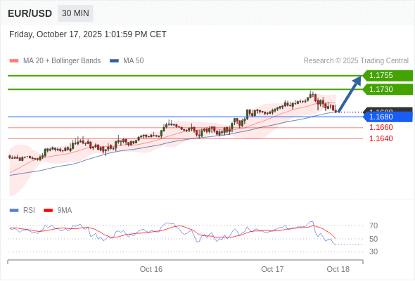 在 1.1680 之上,看涨,目标价位为 1.1730 ,然后为 1.1755 。