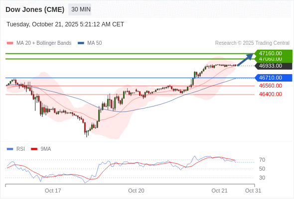在 46710.00 之上,看涨,目标价位为 47060.00 ,然后为 47160.00 。