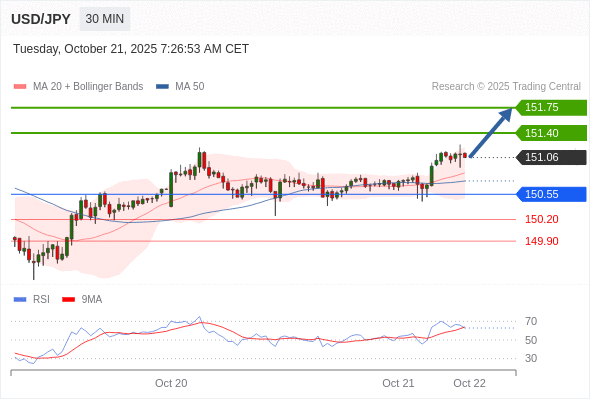 在 150.55 之上,看涨,目标价位为 151.40 ,然后为 151.75 。