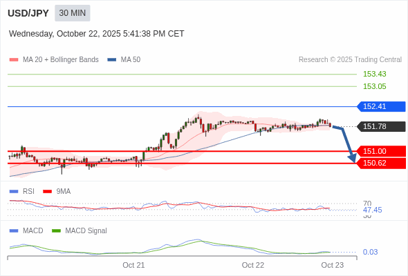 美元/日元 当日内 : 当 152.41 维持阻力位时,存在回归 150.62 的风险。