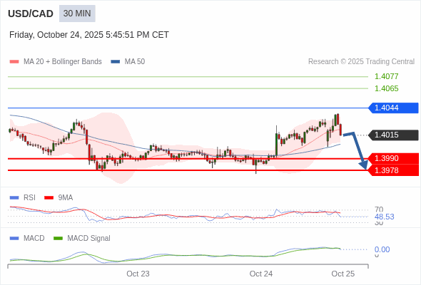 美元/加元 当日内 : 逐渐下跌,当 1.4044 阻碍上行,则 1.3978 为目标位。