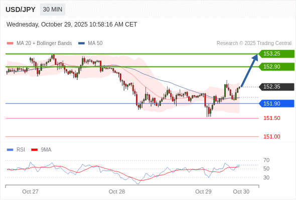 在 151.90 之上,看涨,目标价位为 152.90 ,然后为 153.25 。