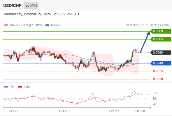 美元/瑞郎 当日内: 在0.7940之上,看涨。