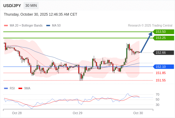 在 152.10 之上,看涨,目标价位为 153.25 ,然后为 153.50 。