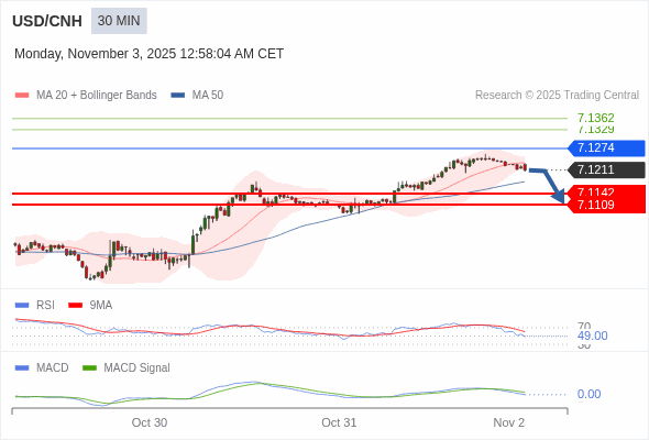 交易策略: 逐渐下跌,当 7.1274 阻碍上行,则 7.1109 为目标位。