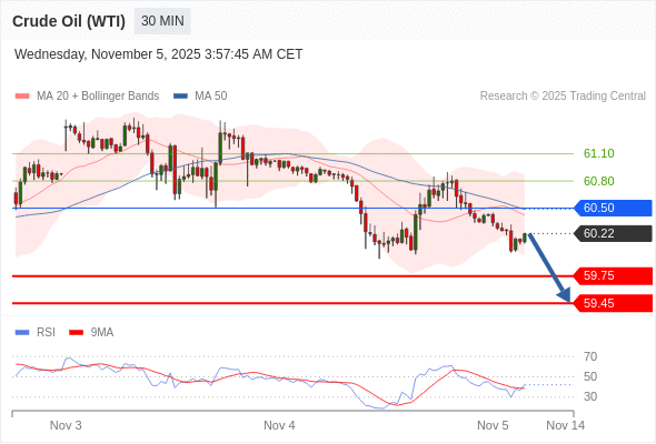 在 60.50 之下,看跌,目标价位为 59.75 ,然后为 59.45 。