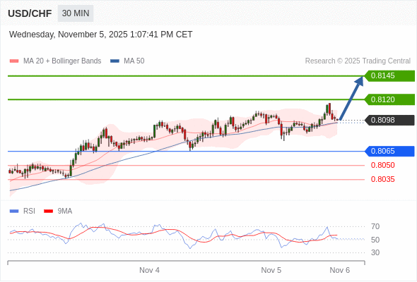 在 0.8065 之上,看涨,目标价位为 0.8120 ,然后为 0.8145 。