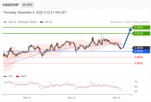 在 0.8080 之上,看涨,目标价位为 0.8125 ,然后为 0.8140 。