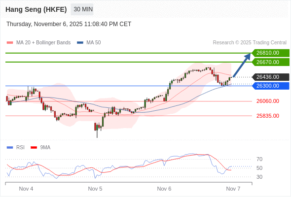 在 26300.00 之上,看涨,目标价位为 26670.00 ,然后为 26810.00 。