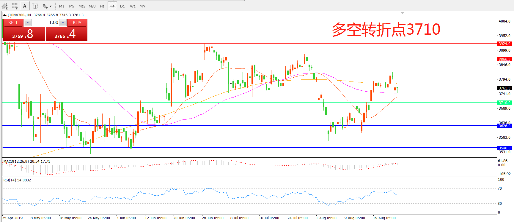 4小时图看,沪深300指数低开后整体维持震荡偏多,55周期均线系统走平,形成下方支撑,MACD红柱增加,RSI指标向上,日内延续上行概率较大。
