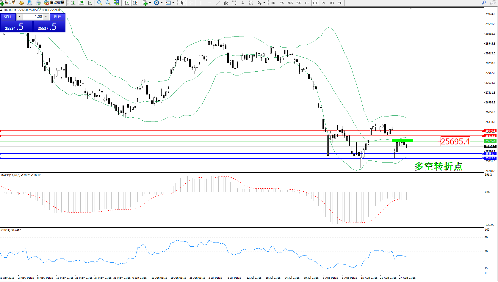 香港恒生指数8月28日(周三)收盘下跌48.59点,跌幅0.19%,报25615.48点;恒指26000附近压制极大,沽盘再度涌出。恒指回落再倒跌,续在低位横行。外围市场多个风险因素叠加,加上债息倒挂等因素令市场忧虑全球经济衰退,美股及港股已经反弹乏力。内外夹击下,若没有实质性的利好消息,相信港股仍将维持震荡格局。