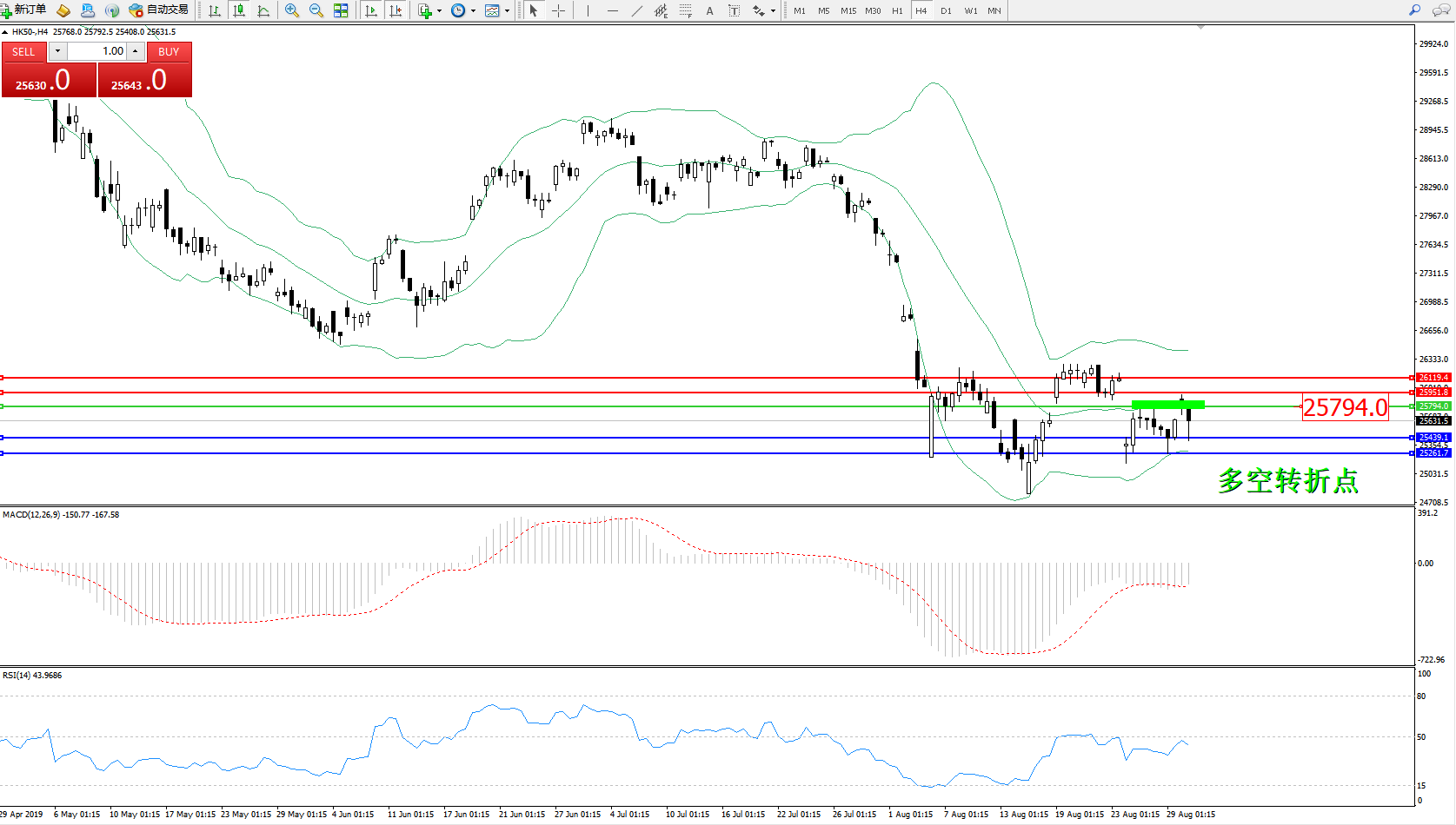 香港恒生指数8月30日(周五)收盘上涨21.23点,涨幅0.08%,报25724.73点;美股反弹两日,港股早上跟随外围市场大幅高开,直冲上26000关口,高见26011,随后卖盘涌现,恒指收窄升幅,并持续在适时位置上横行。目前状况胶着,经贸方面未有实际进展,加上外围及本地风险因素均未完全消除,相信大市仍会窄幅波动,阻力在26000点水平,想入市仍需谨慎。