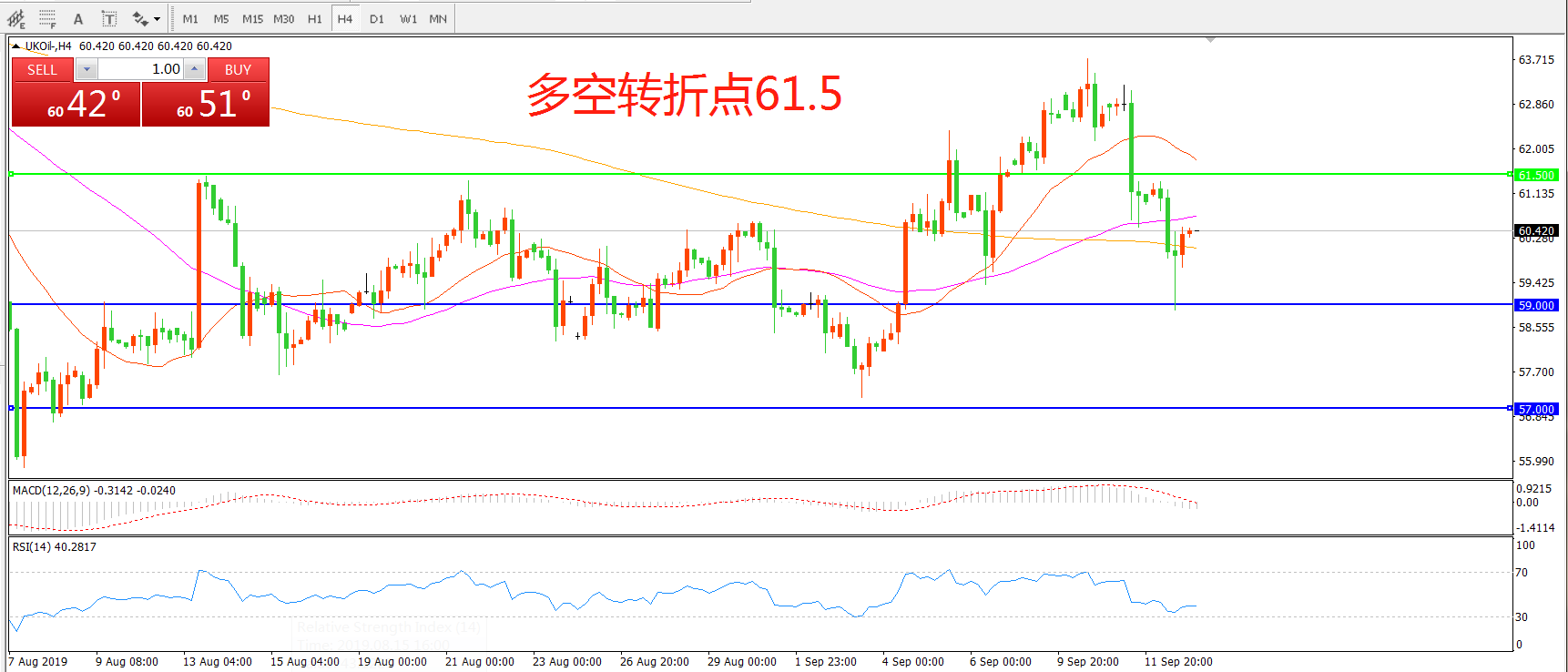 受到欧洲央行宽松举措以及中美贸易方面的消息的影响,金融市场短线剧烈波动, OPEC周四(9月12日)宣布同意要求伊拉克和尼日利亚达成减产来抑制原油供应,任何关于深度减产的正式决定都只能在12月的OPEC政策会议上做出,这令原油多头士气遭受抑制,布油震荡下行,最终收报60.42美元/桶。