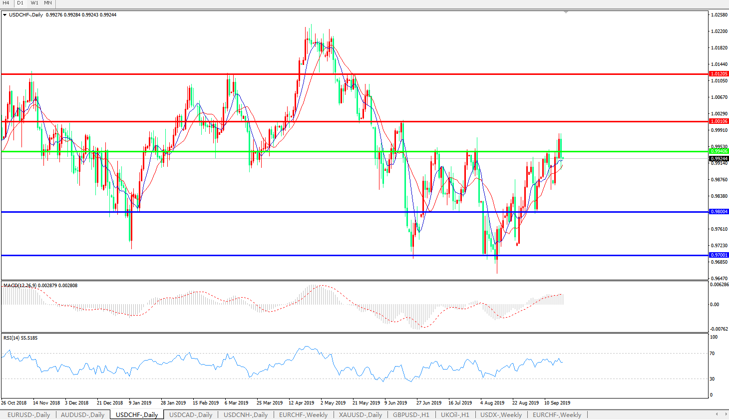 美元兑瑞郎在周四欧洲时段欧洲央行发布利率决议后大幅回落,触及日低0.9920。此前,在美联储隔夜发布利率决议之后,美元兑瑞郎一度升至3个月高位0.9984,但瑞士央行未能跟进降息的状况,却令投资者多多少少感到意外; 虽然,瑞士央行在决议措辞中表现得极度鸽派,称在确有必要时会入市干预汇率,因为瑞郎汇率已被高估,且全球经济与贸易前景存有巨大风险。然而,在此前欧洲央行和美联储都选择了降息的情况下,该国央行却继续按兵不动,这却才是最大的鹰派信号。瑞郎相对欧元和美元的汇价因此跳涨; 在此状况下,市场将观望一旦在欧元汇率续跌的状况下,瑞士央行会否兑现其承诺入市干预,若有,则美元兑瑞郎仍有望在后者汇率与贬值趋势中的欧元半挂钩的背景下升破平价,只是这个过程要比大家此前所预想的更加曲折和复杂
