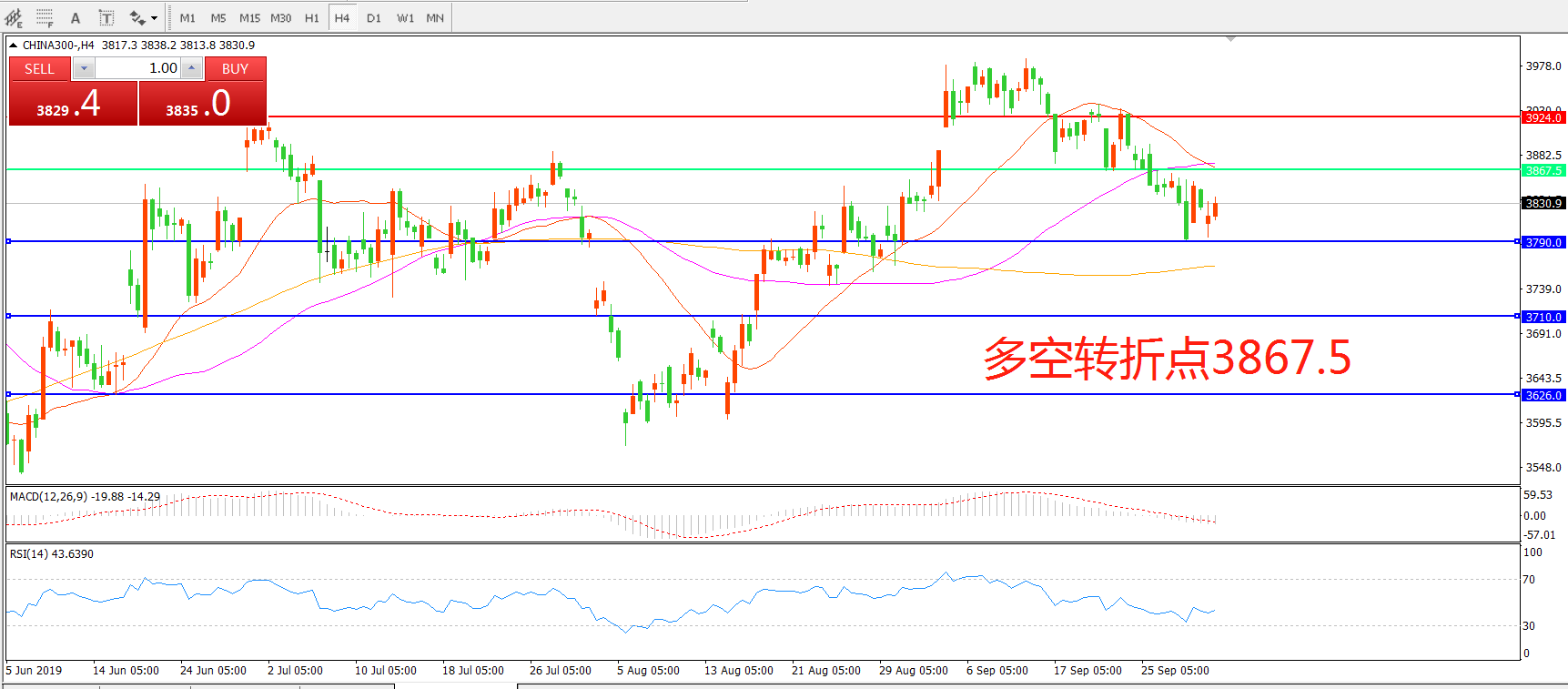 4小时图看,沪深300延续震荡,3790附近成为短期支撑,21周期均线下穿形成死叉,MACD红柱减少,RSI指标向下,日内依然有回落风险。