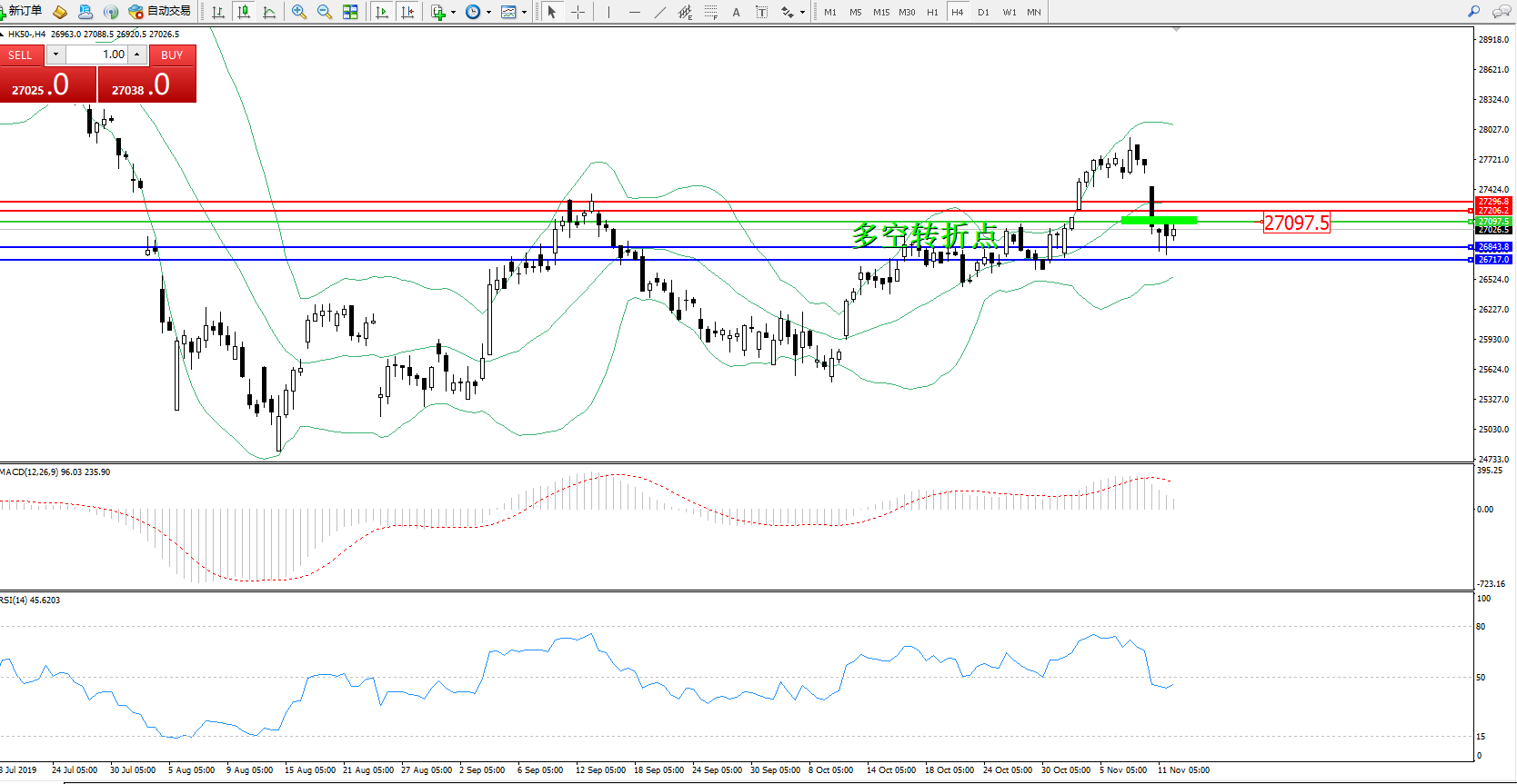 港股经昨日急挫后,早上有见买盘追入。恒指最多升137点,重上27000关口,在社会问题仍未见解决,而投资者也欠缺信心,市况更未见稳定的情况下,沽盘逐步涌出,恒指亦跟随回落再倒跌至收市。特朗普言论跟前有别,市场再次担心已经谈判好的协议会否有变。
