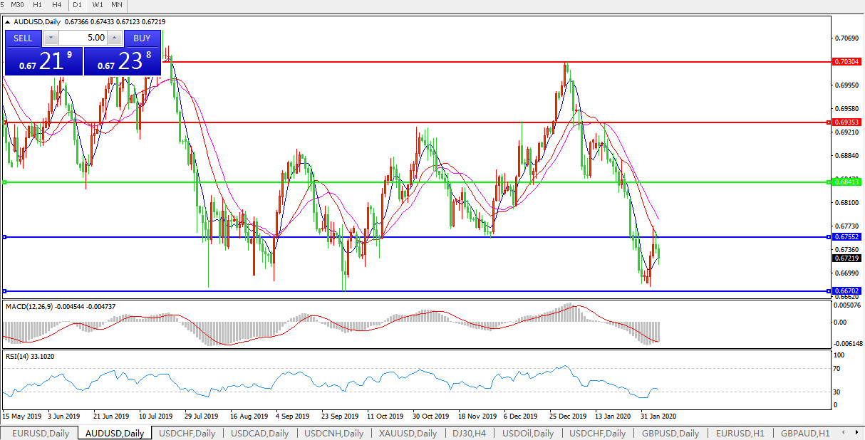 澳元兑美元在周四基本重演了此前在周三冲高回落的姿态,上攻10日均线再度失败,这意味着短线的汇价下行趋势很难改观。虽然本周稍早,受澳洲联储维稳政策不降息消息的带动,澳元兑美元一度跳涨脱离之前的四个月低位,但连续两日上攻10日均线失败,却显示上行动能仍然不足; 日内澳元兑美元汇价在进入欧洲时段后即因为全球范围内风险偏好情绪再度滑落而回吐了早先涨势,受突发风险事件影响,全球经济前景此后仍存变数,这对于面对风险情绪高度敏感的商品系货币澳元而言仍是一重重压。日内若无法收盘在0.6745上方,则后市将很可能进一步下行; 澳元下一步支撑下看0.6720一线,跌破后前期低点0.6679可能再度面临挑战。周五中国将发布贸易账及外汇储备数据,而这将对澳元带来相当程度的走势方向指引。
