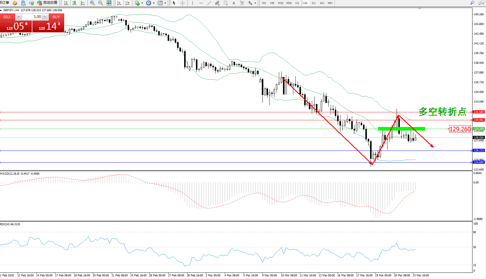 交易策略:129.260下方看跌,目标126.233、124.604