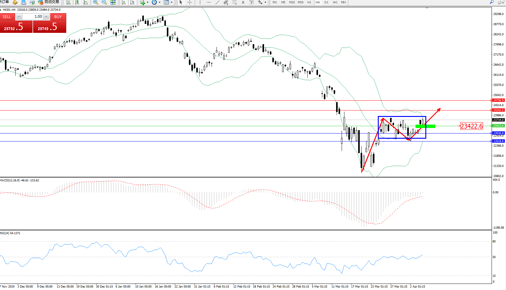 香港恒生指数46日(周一)收盘上涨513.01点,涨幅2.21%,报23749.12点;港股市场高开上涨,盘中主要股指皆升超2%。午后外围市场集体拉升,恒指一度大涨至2.6%。因美国新增确诊或现拐点和沙俄将达成减产协议,全球市场应声反弹十分明显。料市场短期依旧受疫情与油价的发展形势影响。主板成交量为868.14亿港元。从板块表现看,在线教育股强势领涨,香港本地地产股、武汉本地股、半导体、系统软件、手机概念股现普涨行情,影视娱乐跌幅居前,黄金股、电力股明显弱势。