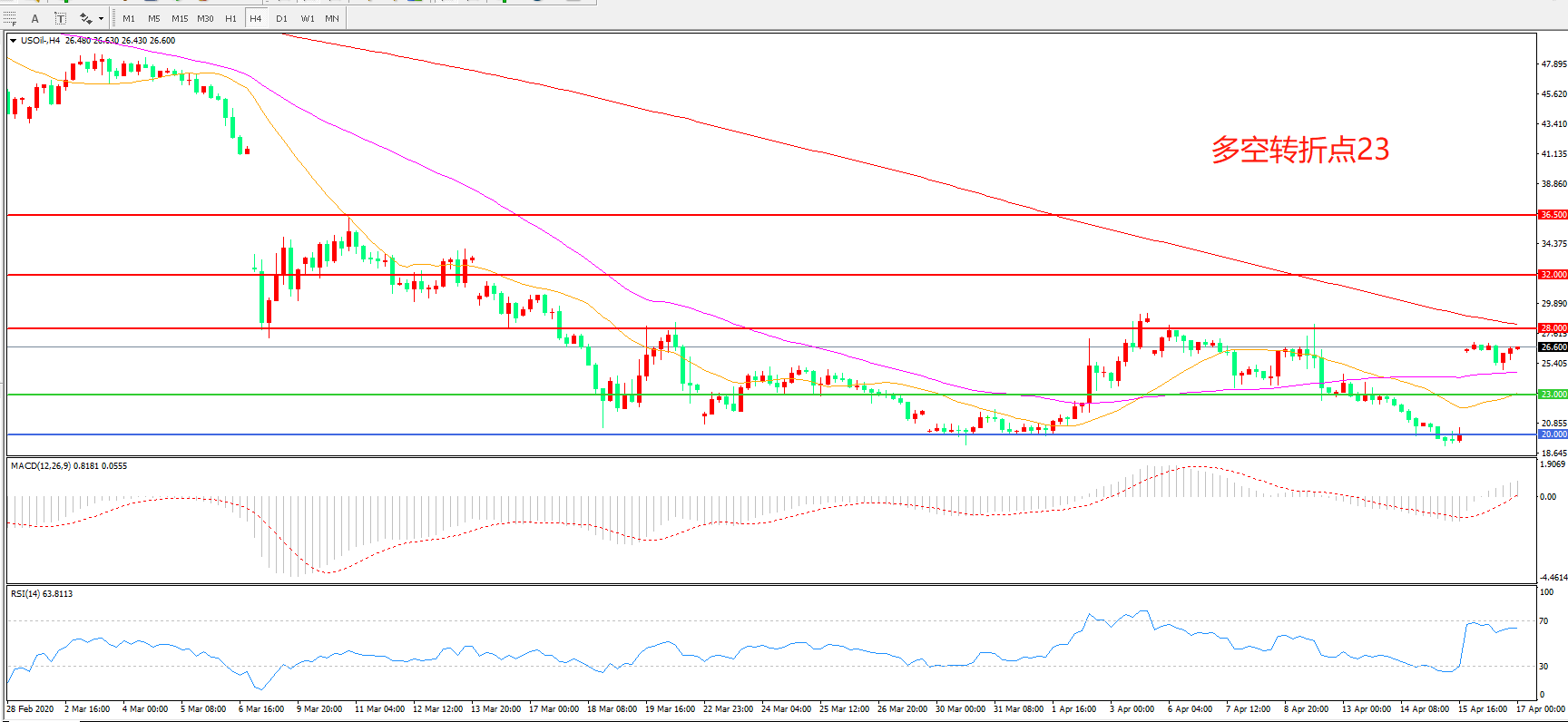 4小时图看,油价整体波幅依然较窄,低位震荡迹象较为明显,23美元成为短期支撑,28美元成为上方阻力, MACD红柱增加,RSI指标走平,日内延续震荡概率较大。
