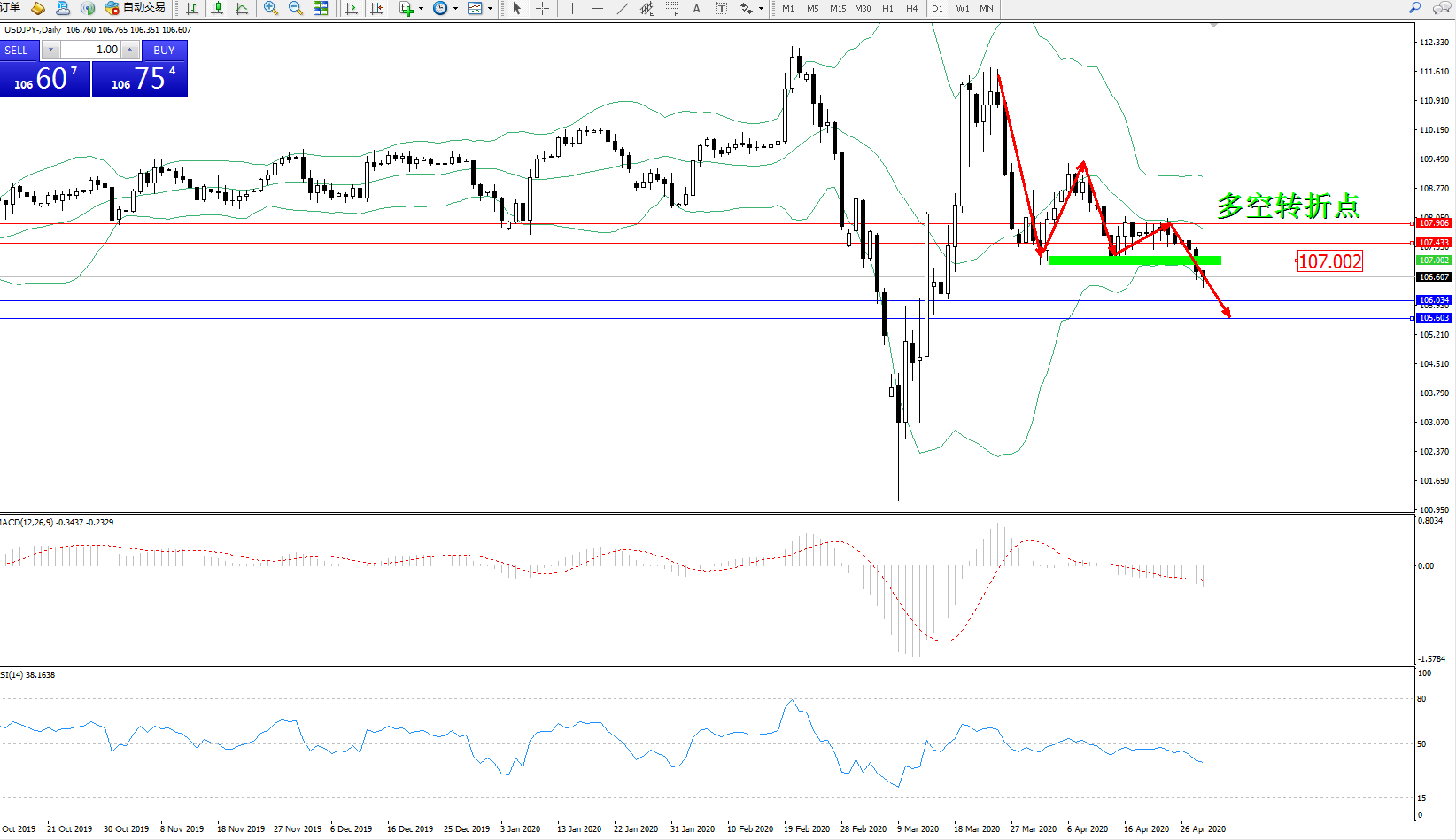 美元兑日元跌0.18%106.68,连续第六天下跌;因美元指数日内仍在继续承压,美国一季度GDP数据标志着经济衰退开始,美联储维持利率在0%-0.25%区间不变,将维持利率在低位,直至美联储有信心通胀能回归正轨。美元兑日元日内料进一步跌向106.25这一关键支撑水平,一旦失守,将进一步下破106关口,而仅有在收复了106.90,并进一步上破107.05之后,短线的加速下行趋势才能得到扭转。同时,由于日本从周三起即进入了“黄金周”公共假期,因此美元兑日元走势后市将更多受到美元指数自身波动的影响,日元与其他非美货币的关联度将提升。