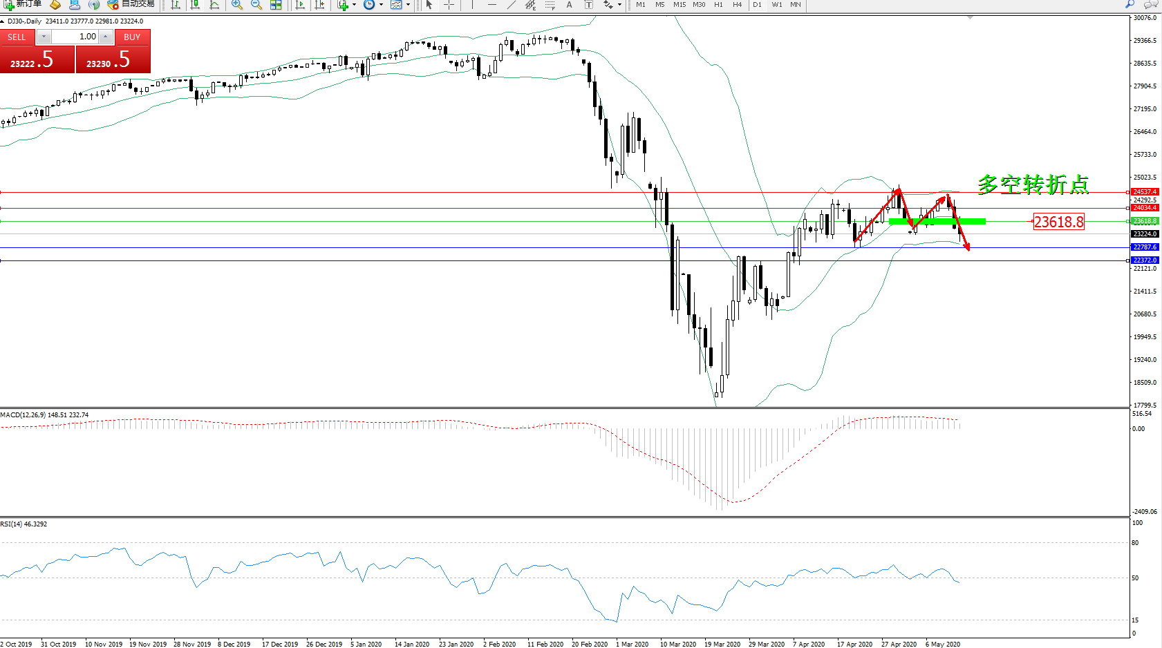 道琼斯指数513日(周三)收盘下跌516.80点,跌幅2.17%,报23247.97点。美股大幅收跌,尽管股指在交易结束前的最后几分钟缩减跌幅,收在日低上方,但投资人看似消化了比之前预期更严重的经济萎缩,担心鲍威尔发出的增加财政刺激的呼吁不会得到回应。鲍威尔暗示美联储不会将利率降至零以下,美联储主席鲍威尔表示当前没有考虑负利率政策,尽管他对经济增长持悲观看法;鲍威尔表示,美国经济面临前所未有的下行风险,如有必要,将采取更多刺激措施,以缓解新冠肺炎疫情对经济的冲击。