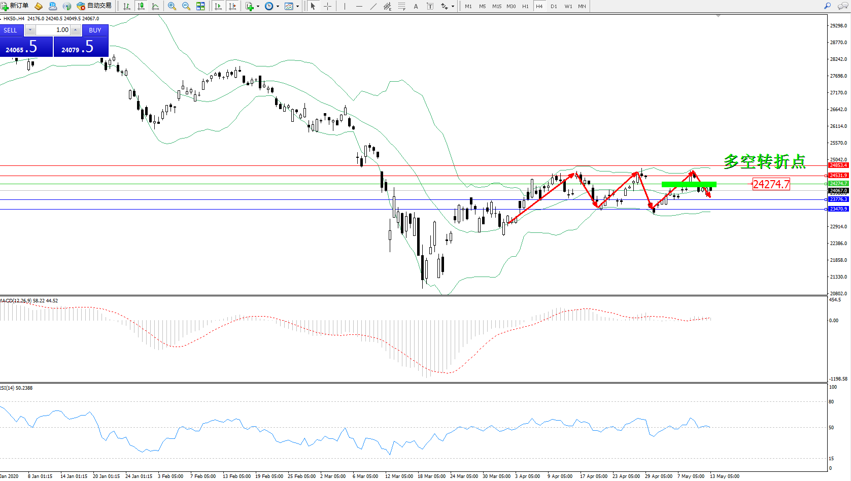 香港恒生指数513日(周三)收盘下跌65.38点,跌幅0.27%,报24180.30点;港股三大指数收盘涨跌不一,医疗设备股强势,威高股份、微创医疗盘中皆创新高;节假日概念股全线上涨,美团大涨5.45%总市值逼近7000亿港元;香港恒生指数上周先跌后涨,节后首个交易日急挫逾千点,其后几日震荡回升,但全周仍累计下跌逾1%。北水资金继续南下,但大市交投并未快速放大,热点股表现较为活跃。从技术上看,恒指24000点附近已拉锯一个月有余,下方支撑明显,留意短线向上突破节前高点的机会。对于全球疫情的忧虑逐步降温,市场焦点回到经济复苏上来,国际贸易关系若能维持平稳格局,也将利好风险偏好回升。港股上周初急挫千点,其后板块个股普遍反弹,但涨幅有所分化。汽车、医药、餐饮、芯片及手机股涨幅靠前,部分热门股表现强势,提升了市场人气。