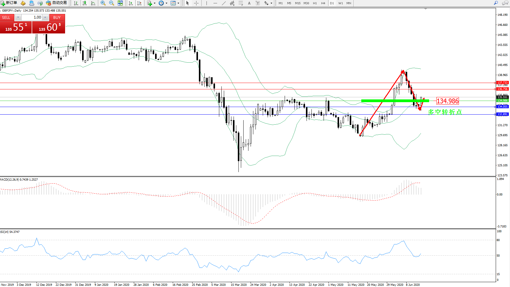 交易策略:134.986上方看涨,目标136.756137.733