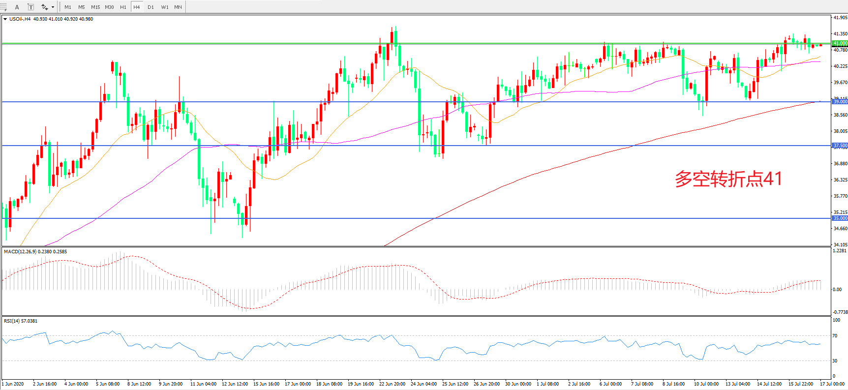 4小时图看,油价延续高位震荡,41美元成为短期争夺焦点,均线系统走平,MACD红柱增加,RSI指标走平,日内延续上行概率较大。