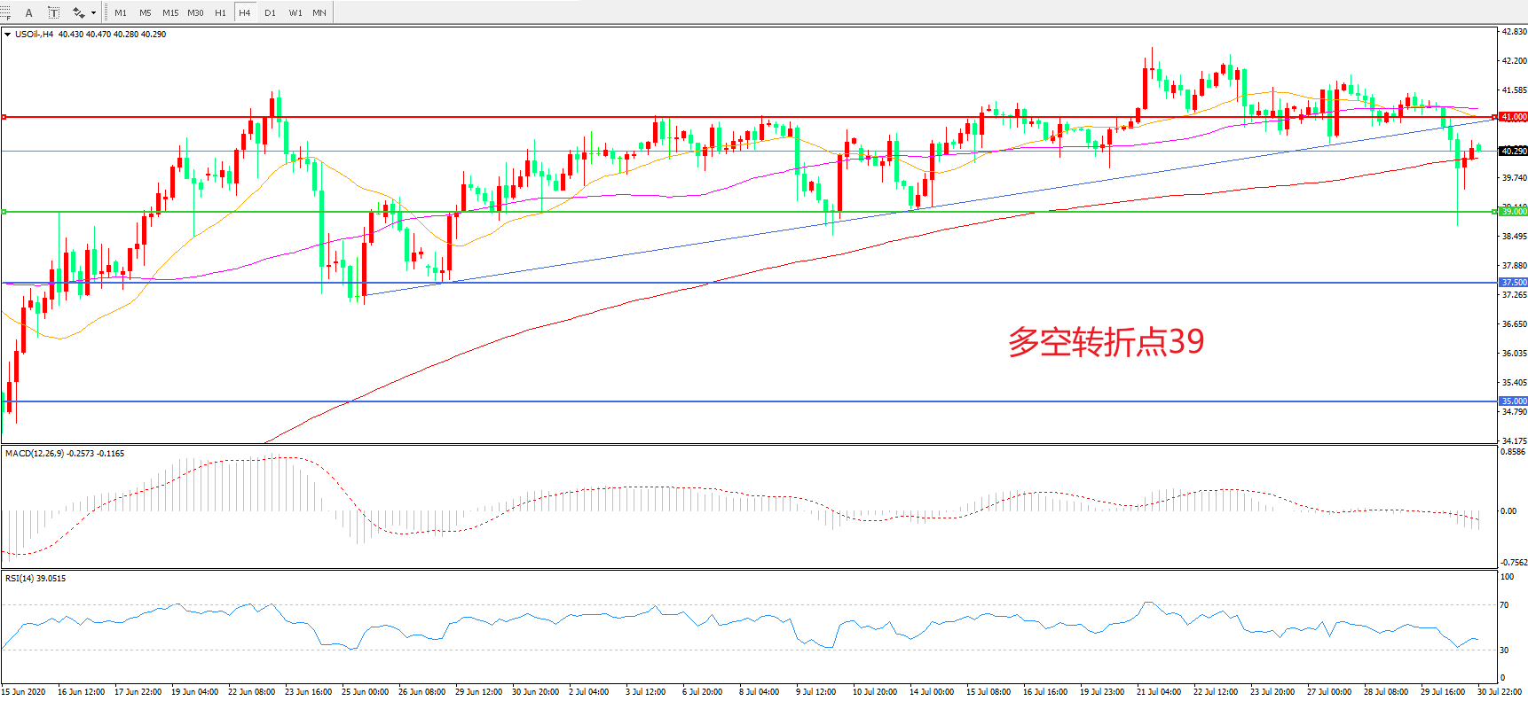 周四(7月30日),资本市场经历连番冲击,美国二季度美国GDP下滑32.9%,创下二战以来最大单季降幅纪录。市场风险情绪受到冲击,美国WTI原油一度跌穿39一线,随后震荡回升,收报40.28美元/桶。
