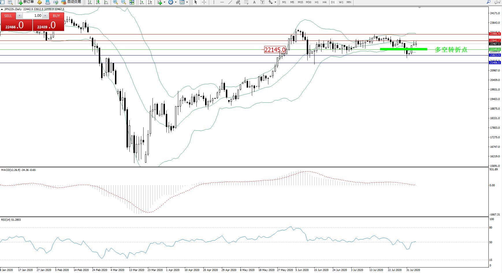 日经225指数8月5日(周三)收盘下跌70.16点,跌幅0.31%,报22503.50点。据日本时事通讯社:日本将为应对新冠疫情准备1万亿日元。据日经新闻:强生预计下月开始于日本进行新冠肺炎疫苗临床测试,目标明年向全球提供10亿剂疫苗。因担忧新冠肺炎疫情,日本冲绳县敦促居民留在家中。日本经济再生大臣西村康稔:有症状的人应避免探亲。希望在跨太平洋伙伴关系协定(TPP)会议上讨论支撑供应链的问题。希望市民遵守专家组的探亲建议。深信强化供应链、实行数字化对于新冠肺炎疫情后的全球经济来说是重要的。就向世界传达自由贸易对经济在新冠肺炎疫情后复苏的重要性而言,跨太平洋伙伴关系协定(TPP)11国会议是个好的机会。