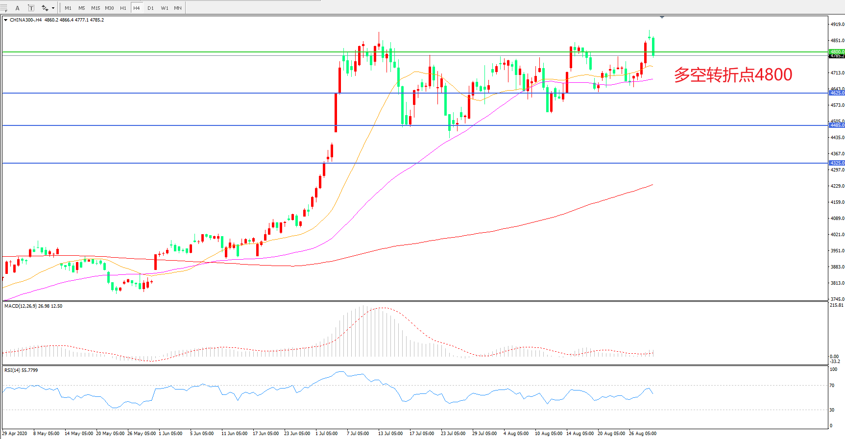 4小时图看,沪深300冲高回落,高位震荡迹象明显,4800成为多空争夺交掉,均线系统走平, MACD红柱增加,RSI指标向下,日内延续上行概率较大。
