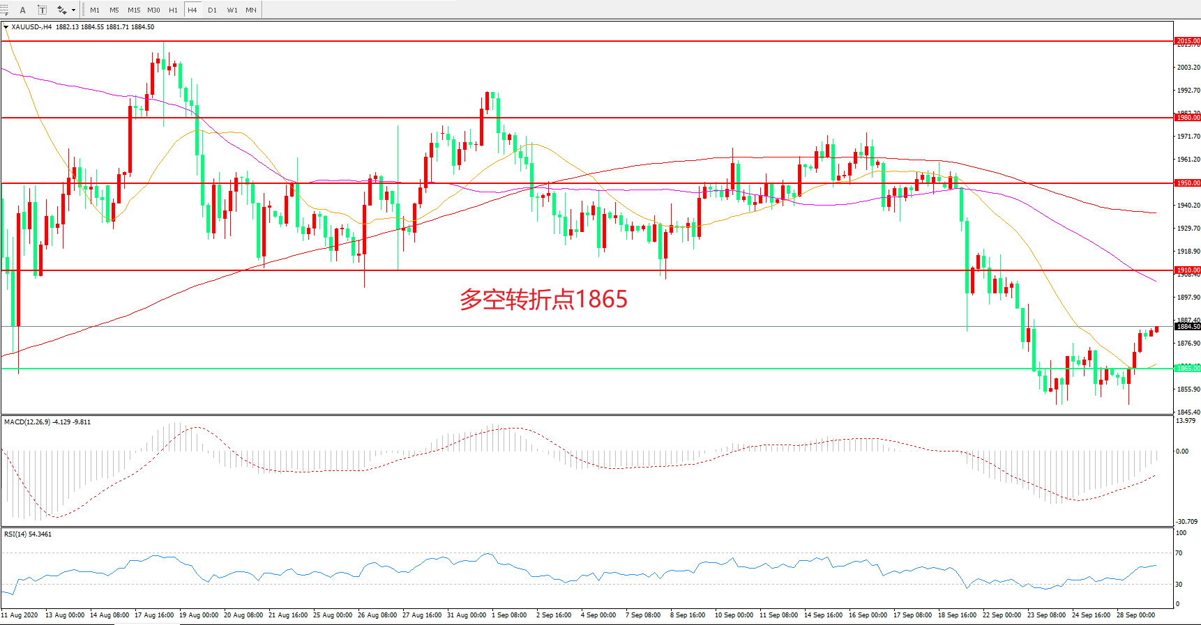 4小时图看,金价延续低位震荡,短期走势仍然低迷,1865一线成为多空分水岭,均线系统呈空头排列,MACD绿柱增加,RSI指标走平,近期延续震荡概率较大。