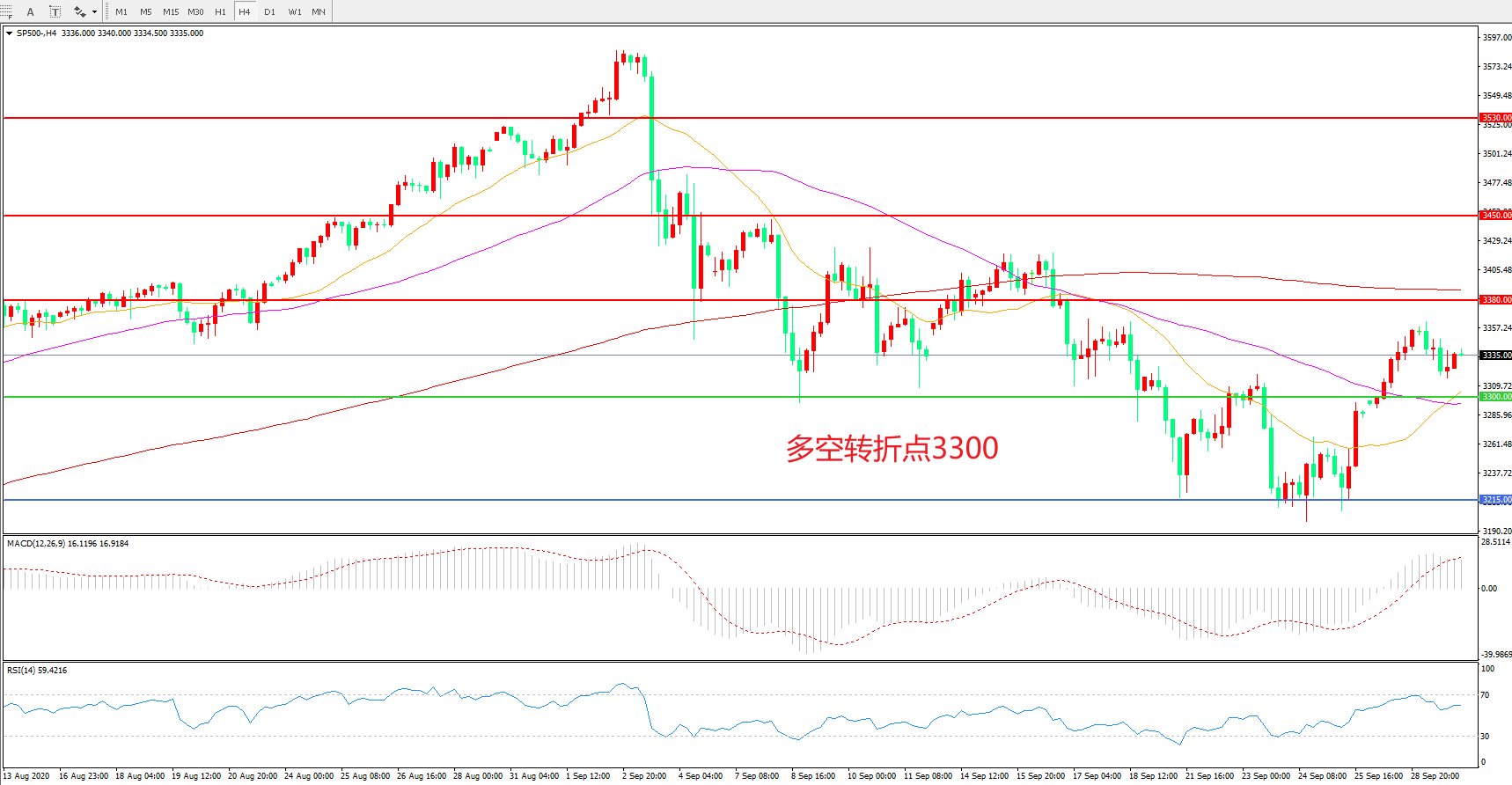 4小时图看,标普500以3300为依托震荡反弹,短期走势回暖,均线系统系统走平,MACD红柱增加,RSI指标走平,日内延续震荡概率较大。