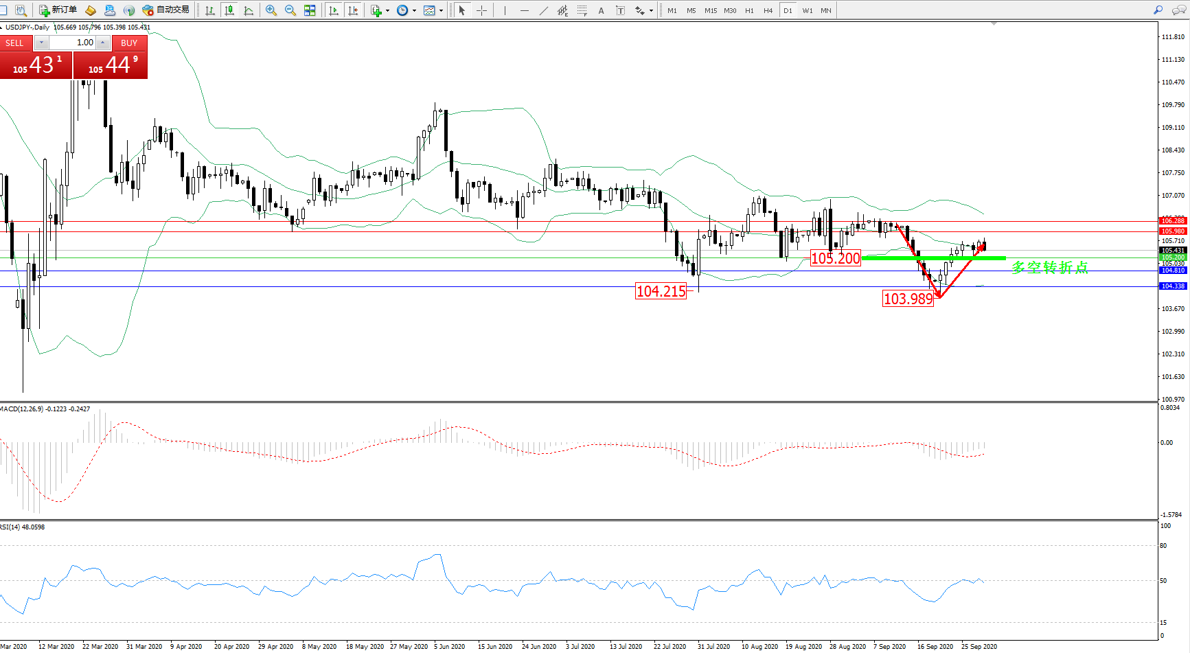 美元兑日圆纠结于105.413附近震荡,美元避险表现依旧好于日元,受美国选举风险加剧市场恐慌情绪升温带动,美元兑日元一度回落脱离早先的两周半高位。但美国大选可能出现双方拒绝承认结果并对簿公堂的前景,令欧美市场的资本正重新考虑加速流向亚太地区的资金避风港。日本实际利率与美国利率之间的差异正在逐渐扩大,这将打压美元兑日元;第四季度该汇率将主要在104水平附近波动,108看起来将成为阻力位;投资者第四季度将关注美国的经济刺激措施,国际局势以及美国收益率,尤其是实际利率的走向,随着10年期美国国债收益率在0.7%附近企稳,美元可能会在第四季度区间波动,略微承受下行压力。