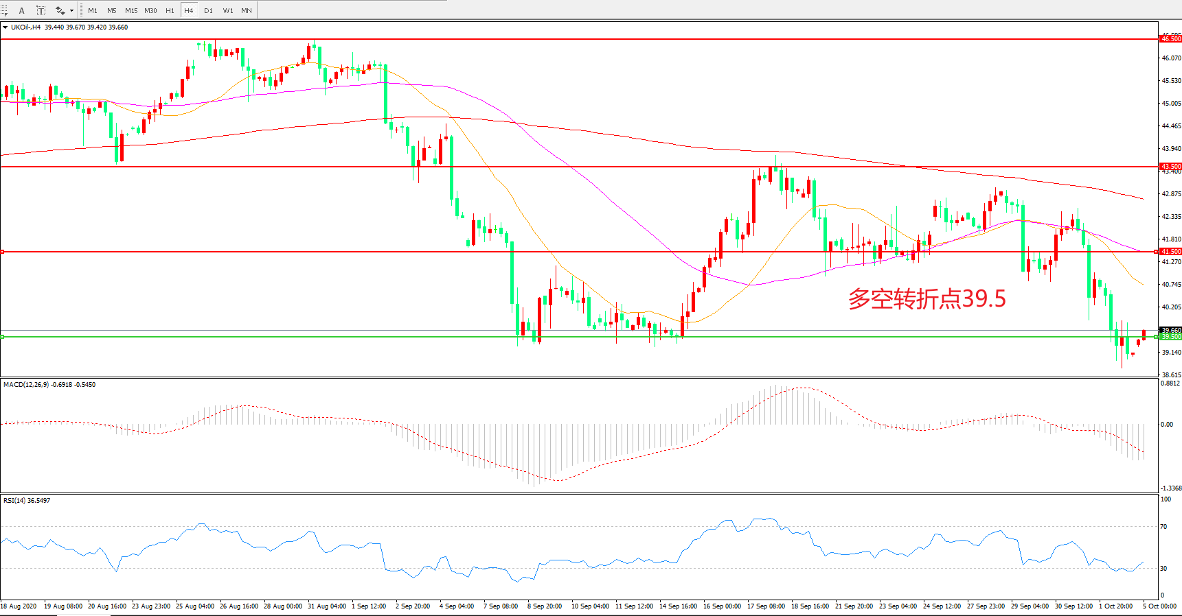 4小时图看,油价长阴下破,整体表现十分低迷,39.5美元多空分水岭,均线系统呈空头排列,MACD绿柱增加,RSI指标走平,日内延续下行概率较大。
