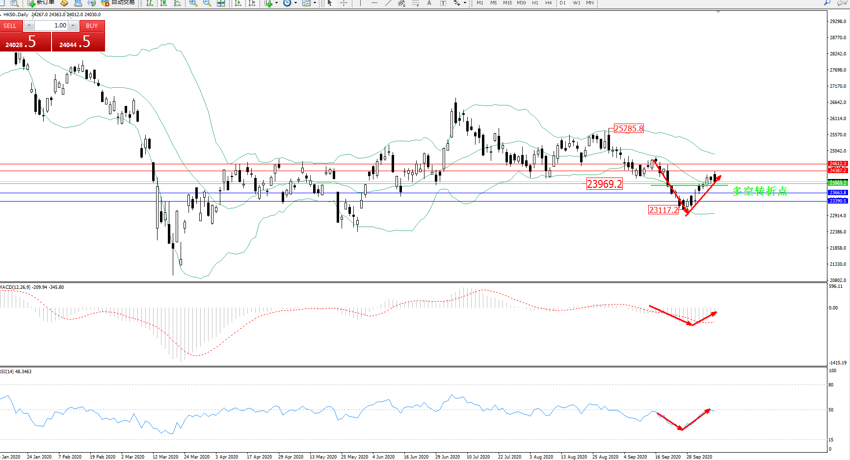 技术点评:空头动力延续布林带指标下轨弱势不断下探,低位抵达23117附近后得到支撑开始整理回升,布林带指标呈收口走势持续下行后开始有走平态势,低位反转回升至中轨上方后弱势整理,突破中轨有继续回升态势,MACD指标处于空头区域低位整理缓慢回升中,RSI指标处于空头区域持续震荡下行后得到支撑开始反转上移,触及50均衡线附近徘徊中;