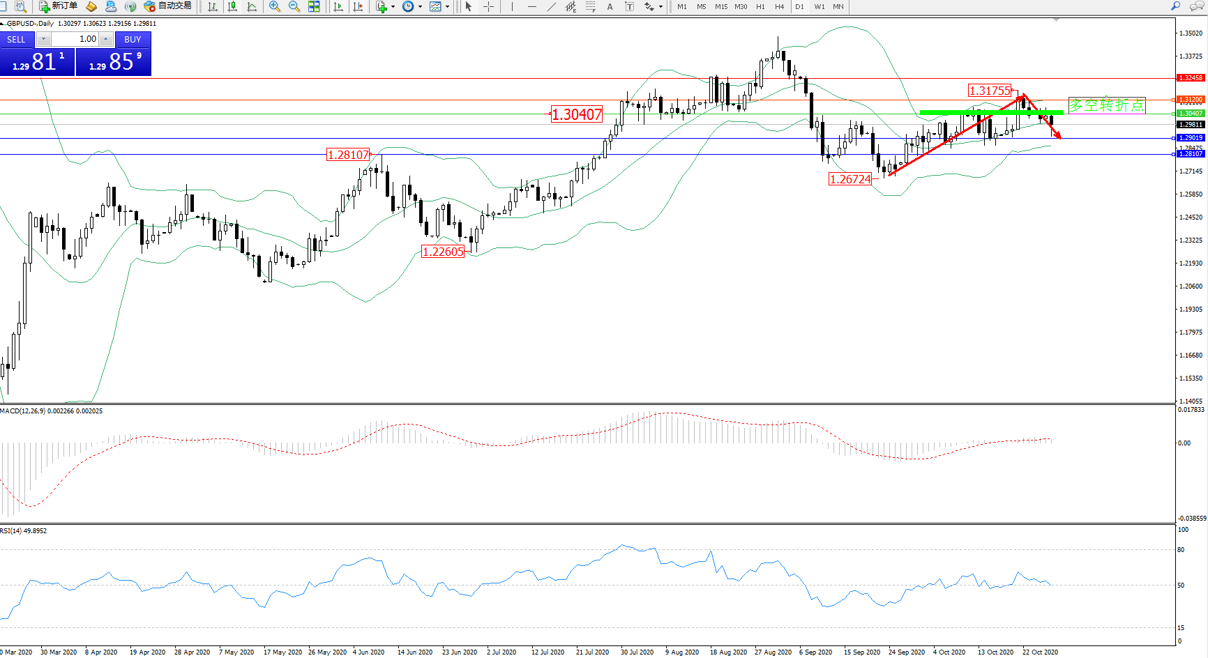 交易策略:1.30407下方看跌,目标1.29019、1.28107
