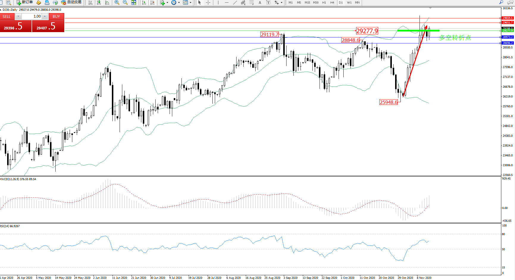 道琼斯指数11月13日(周五)收盘上涨399.60点,涨幅1.37%,报29479.81点。美股三大指数集体收涨,道琼斯工业平均指数升至疫情前水平;尽管新冠病例激增可能导致更多防疫措施出台,进而打压经济增长,但向经济敏感板块轮动的势头还是再度升温。迪士尼受业绩提振大涨,思科营收预测向好,股价攀升。特斯拉首席执行官马斯克发推文称他可能感染新冠,股价下跌。美国股市势将迎来“消化期”。风险偏好推动了市场向价值板块和周期性板块的轮动,更具防御性的板块则表现落后。就像是来回拉锯,人们更乐观的时候,周期性更强的板块就会反弹,乐观情绪减弱的时候,科技股就反弹。市场心理已经发生了一些变化已经发生了一些变化,人们意识到疫苗的大规模推出将需要时间,而接种需求却是迫在眉睫。没有刺激措施出台的事实似乎正在限制金价的上涨空间…如果国会实际上提出了一个有限的方案,那也是有益的。