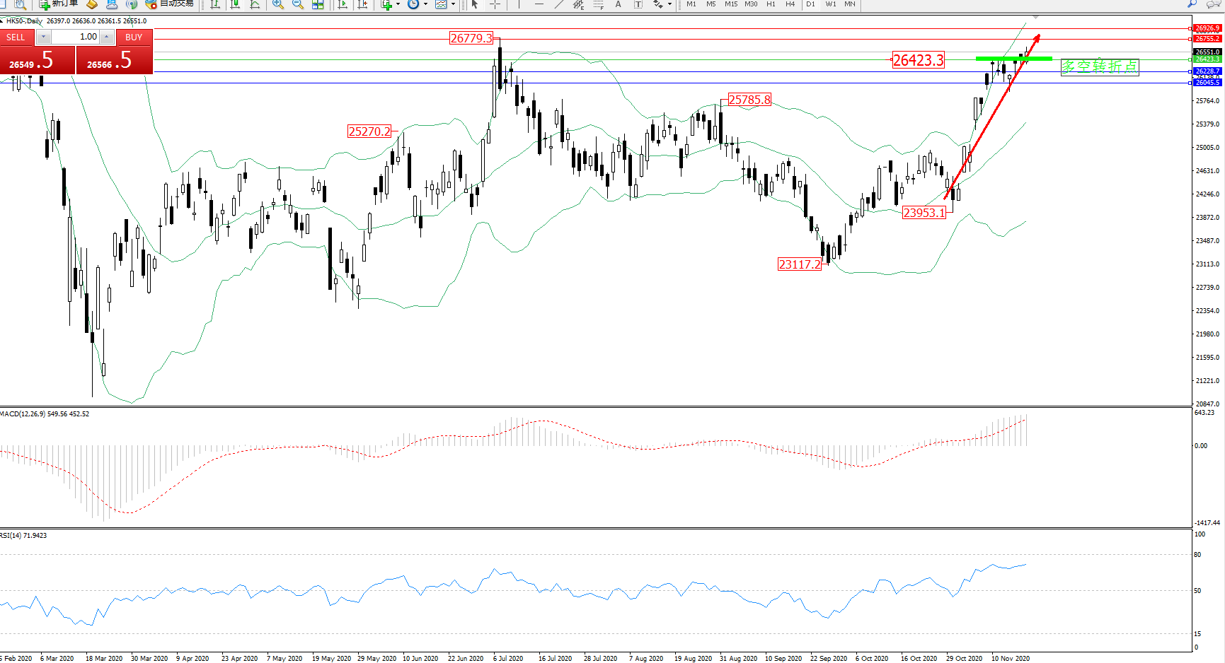香港恒生指数11月18日(周三)收盘上涨129.20点,涨幅0.49%,报26544.29点;港股主要指数均收涨,日K线三连涨,创7月7日以来的逾4个月新高。恒生科技指数涨0.49%。金股、乳制品、苹果概念股普遍上涨,恒生科技股涨跌各半,腾讯涨1.3%,美团、京东、网易小幅收跌;纸业股大跌居前,玖龙纸业跌近8%表现最差;建材水泥股、水务股、消费电子板块全天弱势。今日南下资金净流入29.29亿港元,大市成交额为1337.72亿港元。2021年港股将迎来久违的指数牛市。经济复苏、价值重估,有利于目前价值股占比大的恒指、恒生国企指数;港股性价比好于A股和美股。港股恒生指数和恒生国指正发生脱胎换骨的进化。港股正在进行由价值向成长的蜕变。恒指估值提升也将是未来主旋律。港股估值或进一步向美股靠拢,提升整体中资股票在全球的吸引力,增加海外资金对中国市场的配置比例。