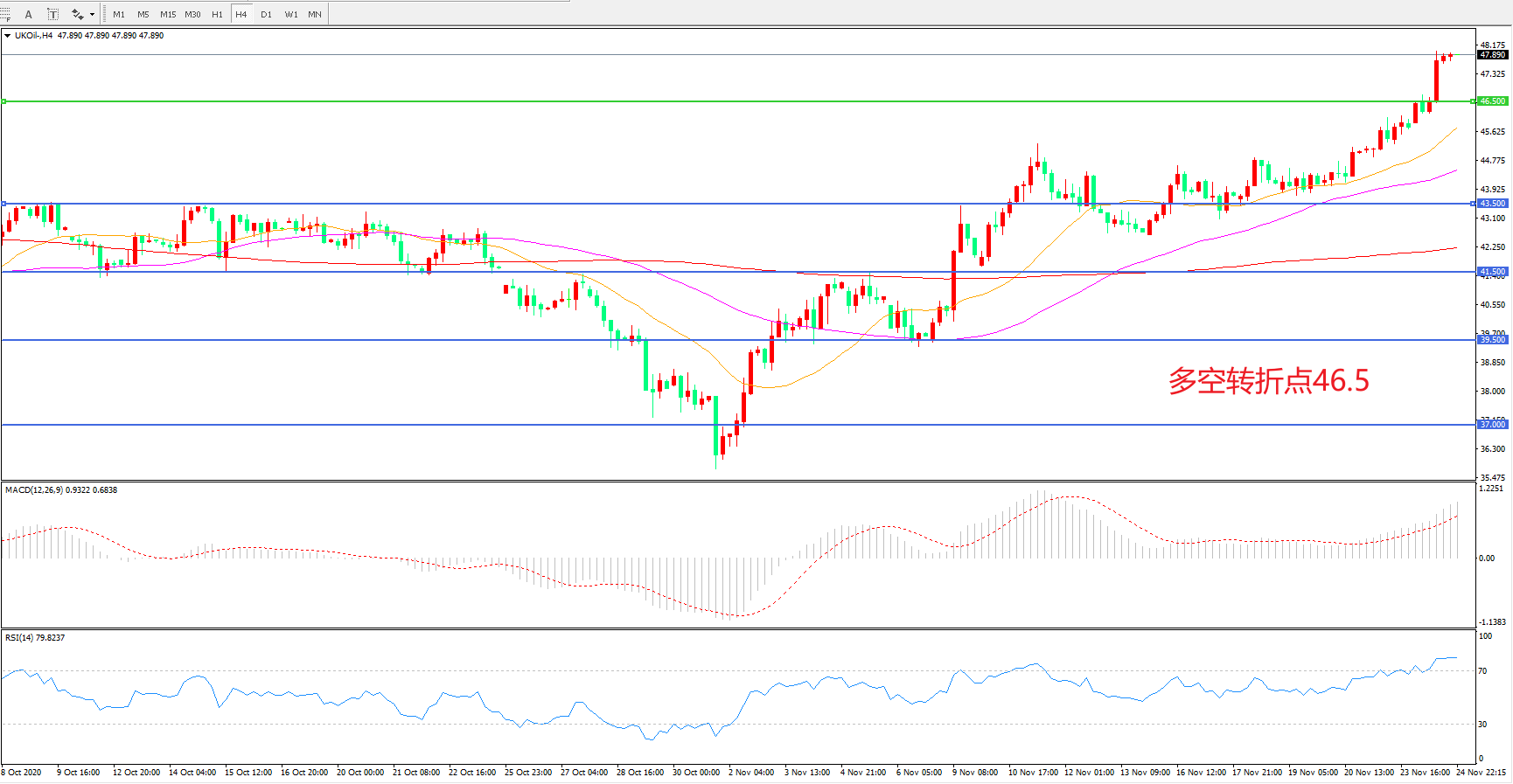 周二(11月24日),在美国大选不确定性消除、疫苗利好、全球央行宽松政策等多重因素助推下,原油市场迎来了一场“狂欢”,布伦特原油最大涨幅接近4%,收报47.89美元/桶。从目前的情况来看,原油价格一鼓作气的突破了上方的压力区间,表明市场已经进行了中枢上移的过程,新一轮的行情已然来临。